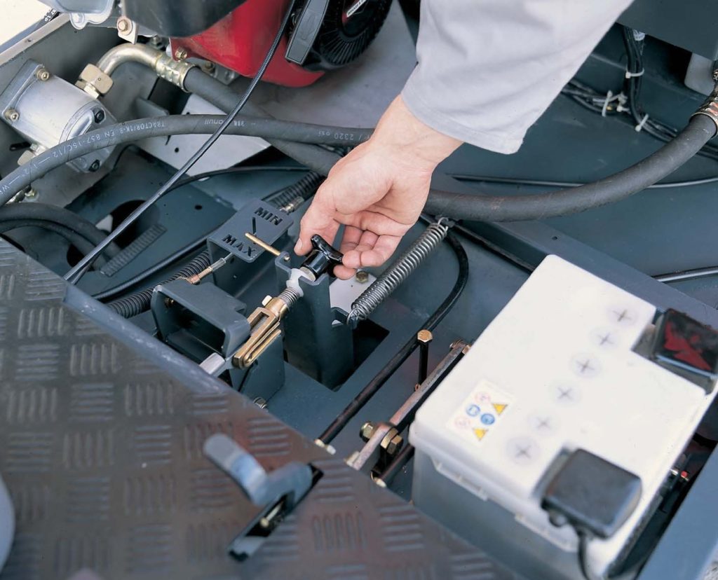Sistem de acționare | Motor electric acționat de 2 baterii fără întreținere x 12 V = 24V, sau: Motor pe benzina in 4 timpi. 4,9 kW la 3600 r.p.m, Rezervor – 3,8 litri. Dispozitiv de pornire electrică, transmisie hidrostatică |